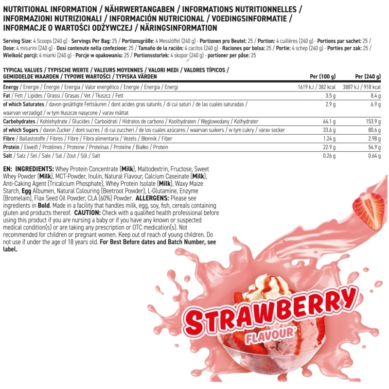 | Whey Protein Concentrate (Milk), Maltodextrin, Fructose, Sweet Whey Powder (Milk), MCT-Powder, Inulin, Natural Flavour, Calcium Caseinate (Milk), Anti-Caking Agent (Tricalcium Phosphate), Whey Protein Isolate (Milk), Waxy Maize Starch, Egg Albumen, L-Glutamine, Enzyme (Bromelain), Flax Seed Oil Powder, CLA (60%) Powder. |