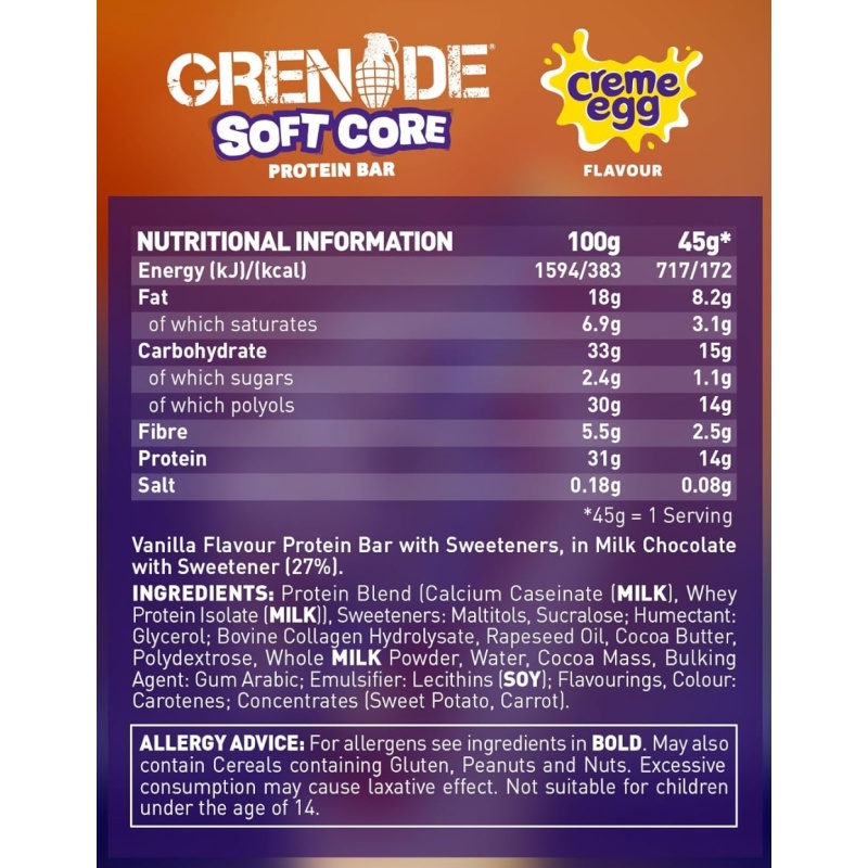 Irresistibly soft and sweet-tooth satisfying, our newest smash-up is built different. Featuring a totally smashable NEW Soft Core, made from light, fluffy protein dough packed with a Creme Egg flavour filling. All covered in smooth, delicious milk chocolate… it’s a full-on Grenade taste explosion.