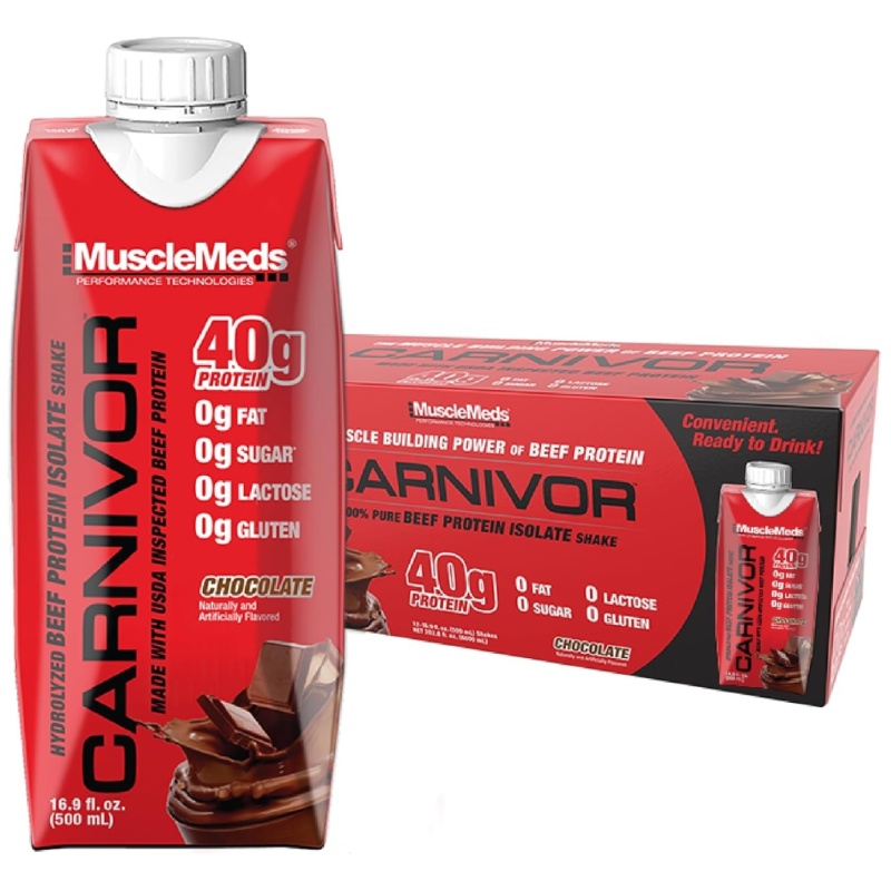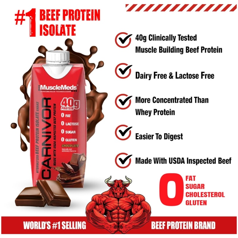 Enjoy the great taste and quality muscle building nutrition of Carnivor, the world's no. 1 selling beef protein isolate supplement, in a delicious ready-to-drink shake. Carnivor RTD is the first high protein shake of its kind to be made with USDA inspected beef protein. Its advanced hydrolysis technology provides 40 grams of muscle building protein per delicious serving with 0 fat, 0 cholesterol, 0 sugar, 0 lactose and 0 gluten. Plus, Carnivor RTDs are loaded with amino acids from high quality beef protein and fortified with branched chain amino acids (BCAAs).