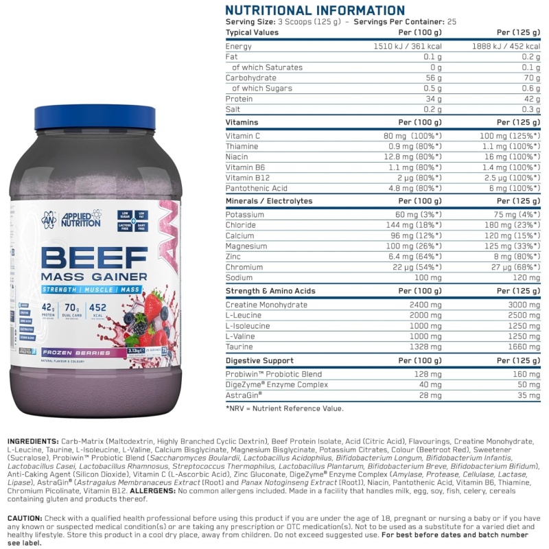 Beef Mass Gainer on toores jõud topsis. Iga portsjon annab tohutult 42 g puhast veiselihavalgu isolaati koos kõrge jõudlusega kahe allika süsivesikute maatriksiga , mis on loodud olulise lihaskasvu, jõu ja taastumise soodustamiseks .
