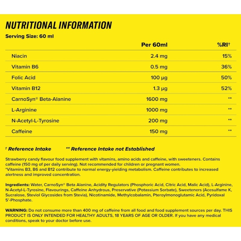 C4 Original Pre-Workout Shots on taskuraketid, mis sisaldavad 1,6 g CarnoSyn® beetaalaniini, 1 g arginiini, 200 mg L-türosiini ja 150 mg kofeiini, mis on pakitud väikesesse 60 ml portsjonisse.